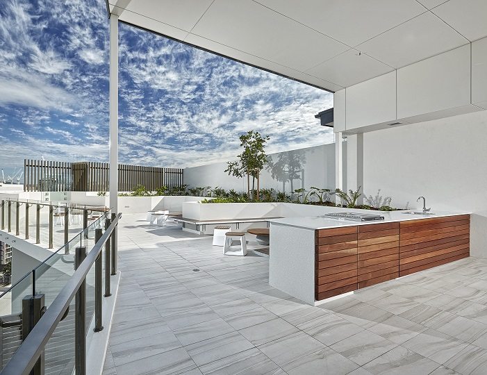 The aqua development also incorporates a significant number of feature screens and green-wall structures to the carpark façade, and a separate café structure constructed over the existing podium and situated on the Ann Street frontage. The café building incorporates a warped feature roof constructed from structural steelwork.